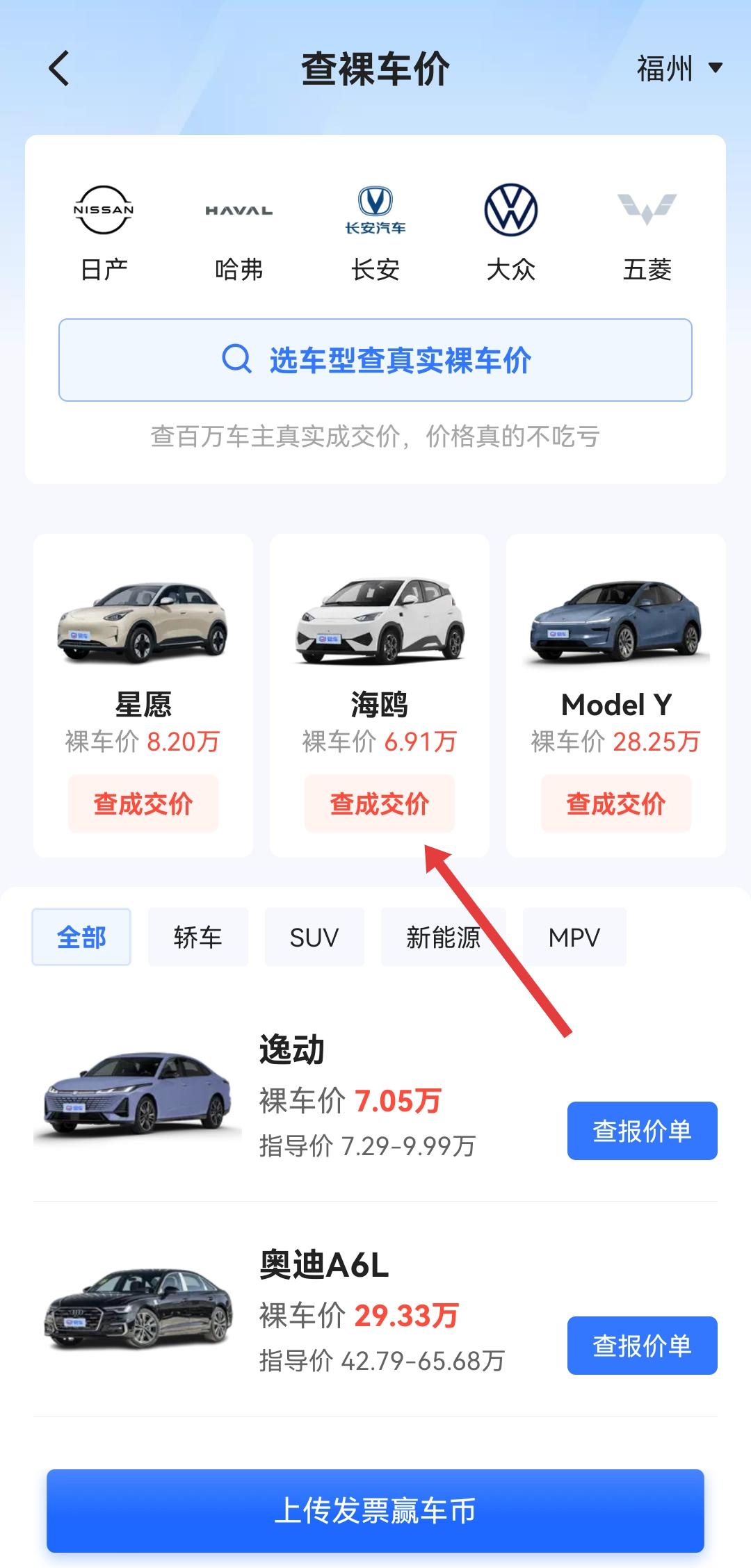 3、在查裸車價頁面,選擇目標(biāo)車型如示例中的海鷗,點擊其下方的查成交價按鈕。