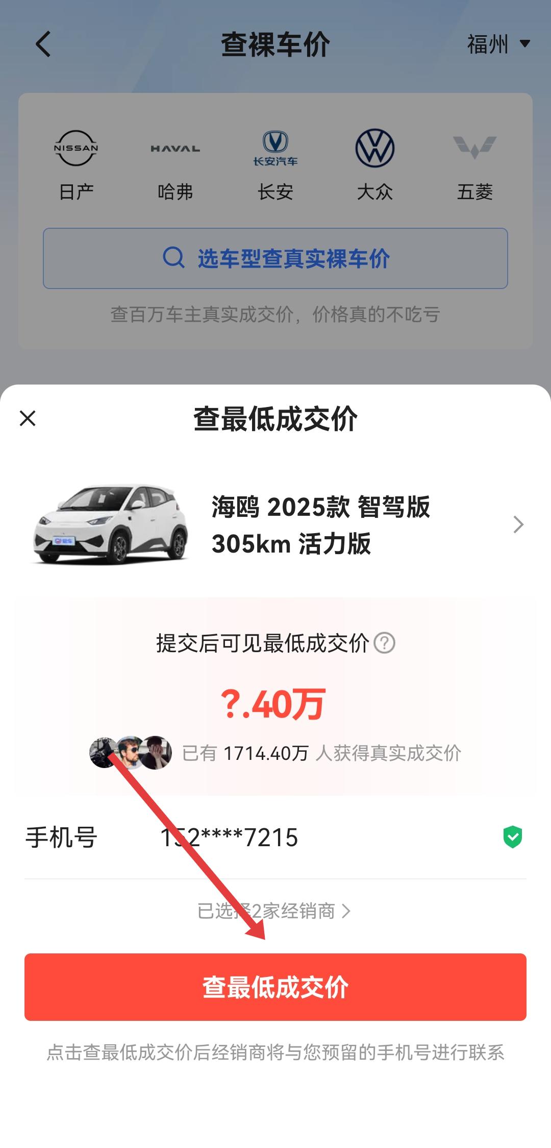 4、在彈出的查最低成交價窗口中,點擊查最低成交價按鈕,提交信息后即可查看該車型的真實底價。
