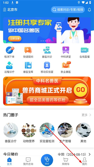 1、打開中科名獸醫(yī)APP,點(diǎn)擊底部導(dǎo)航欄中的我的。