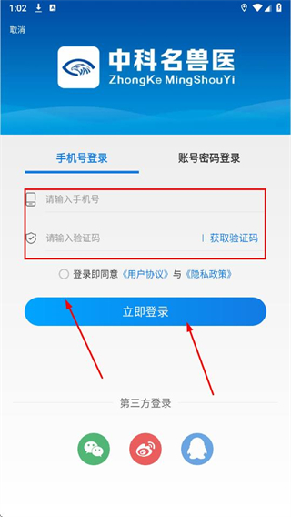 3、輸入手機(jī)號、驗(yàn)證碼,勾選用協(xié)議,點(diǎn)擊立即登錄,完成賬號登錄。