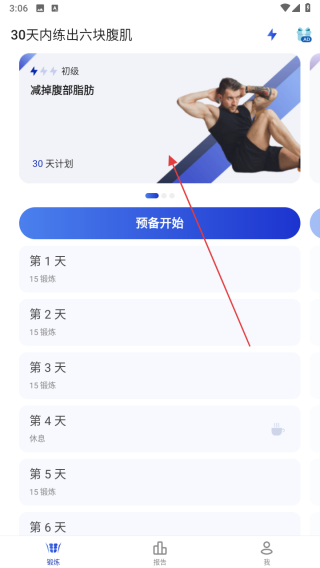 1、進入30天內練出六塊腹肌界面,依據(jù)自身運動基礎,選擇初級或中級難度,初級聚焦腹部脂肪消減,中級強化腹肌硬度,選定后查看30天訓練規(guī)劃。