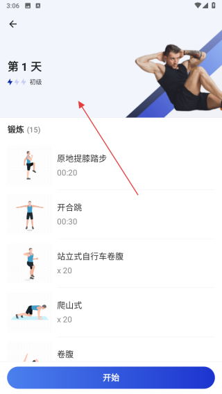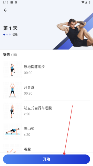 3、確認訓練內容后,點擊開始,跟隨APP動作演示與節(jié)奏,完成當日訓練,堅持按計劃逐天進行,把控動作標準,積累訓練成果,邁向目標。