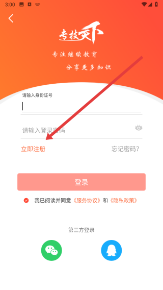 1、在專技天下登錄頁面中,若沒有賬號可以點(diǎn)擊下方立即注冊按鈕,進(jìn)行注冊。