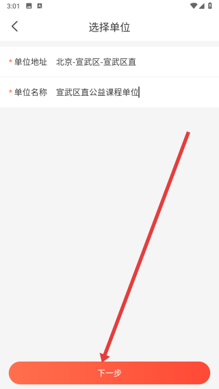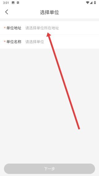 2、在進(jìn)入到選擇單位頁面中,點(diǎn)擊輸入框依次填寫單位地址和名稱。