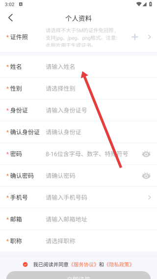 4、在進(jìn)入到個人資料頁面,點(diǎn)擊輸入框依次填寫對應(yīng)的信息后,即可完成注冊操作。