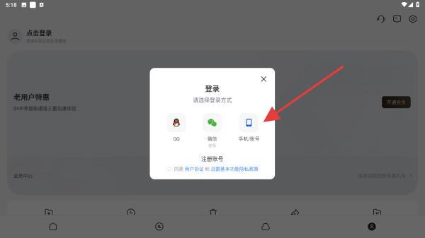 3、在彈出的登錄頁面中,選擇手機賬戶登錄,并勾選。