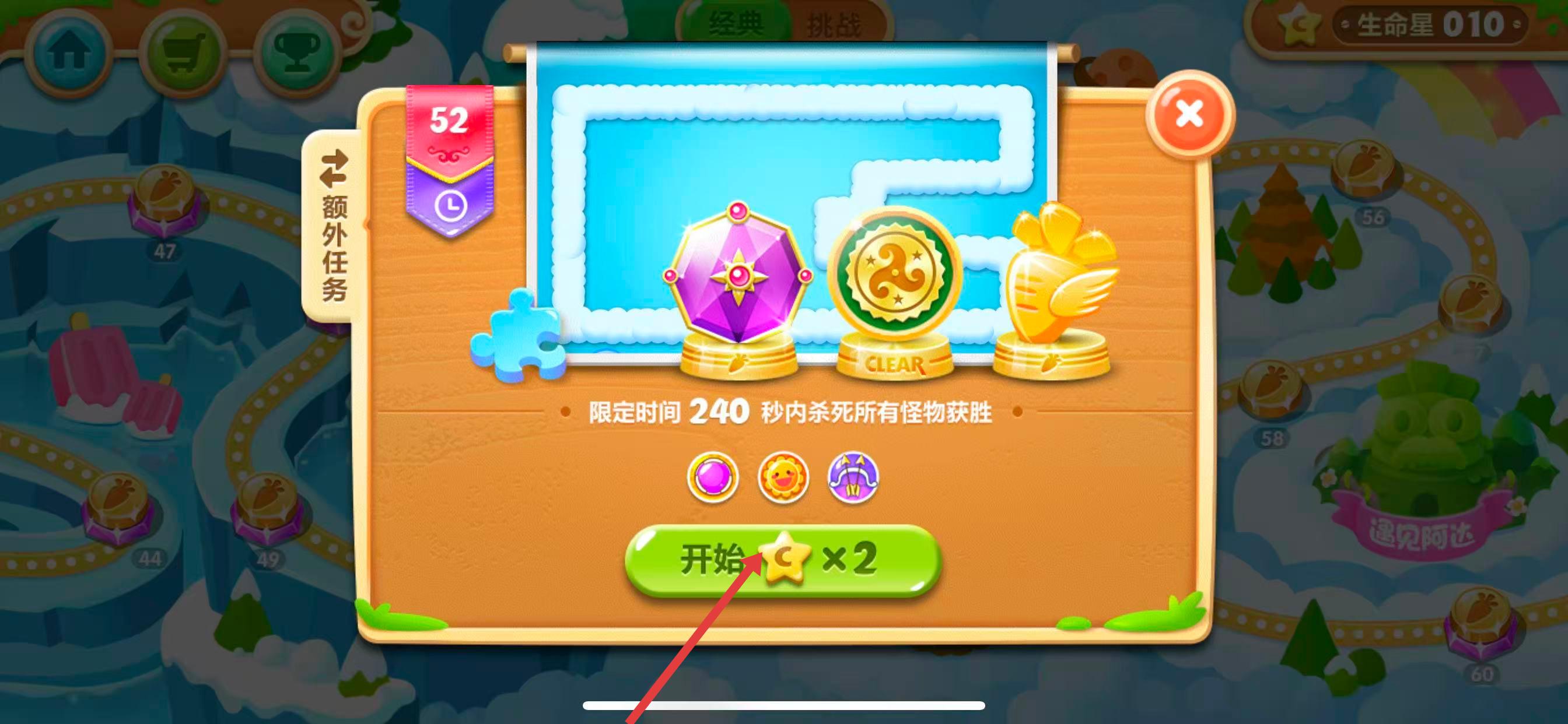 2、在關(guān)卡詳情頁,確認(rèn)限定240秒內(nèi)殺死所有怪物的勝利條件,點(diǎn)擊開始按鈕,消耗2顆星星進(jìn)入第52關(guān)游戲界面。