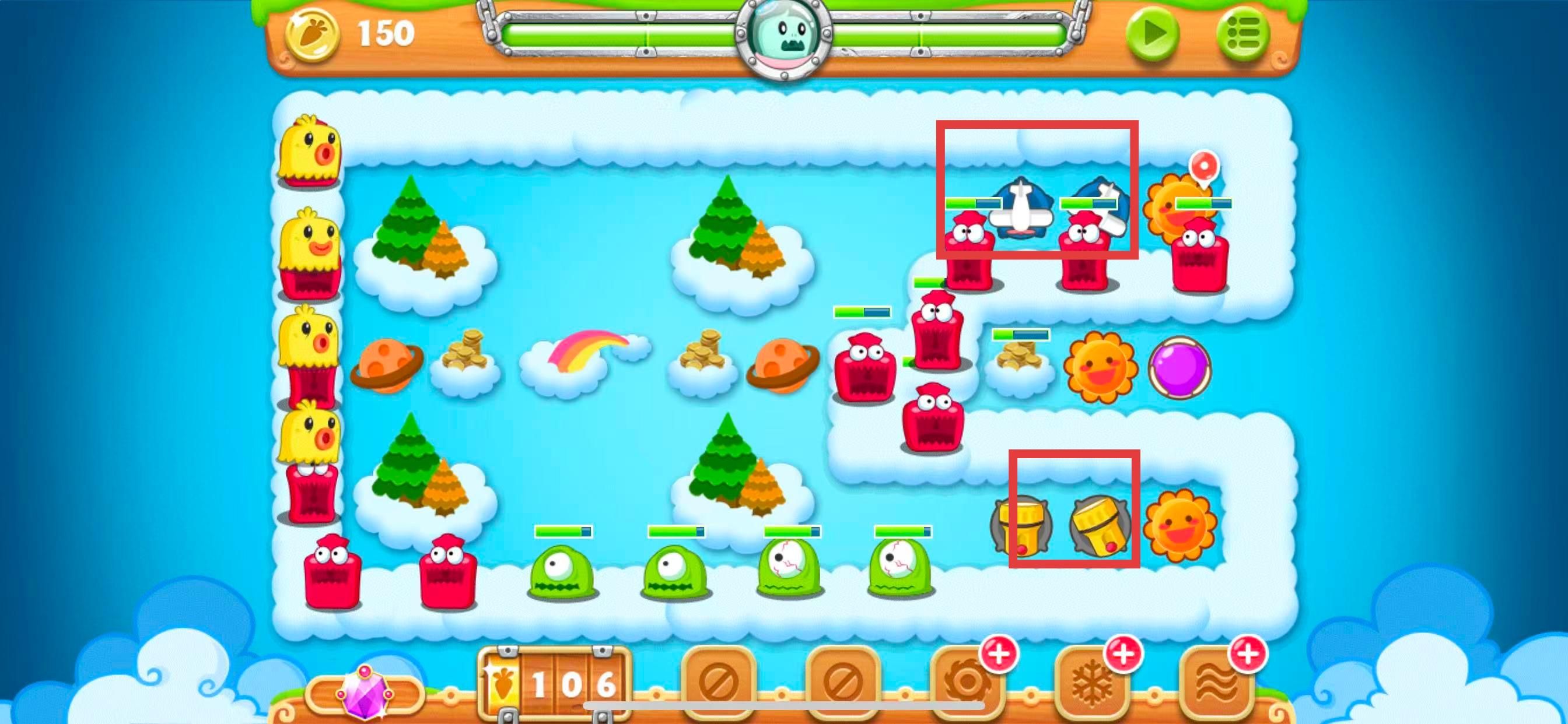 3、進(jìn)入游戲后,優(yōu)先攻擊標(biāo)記的位置,打出飛機(jī)和手電筒的炮塔,推動(dòng)消滅怪物進(jìn)程。