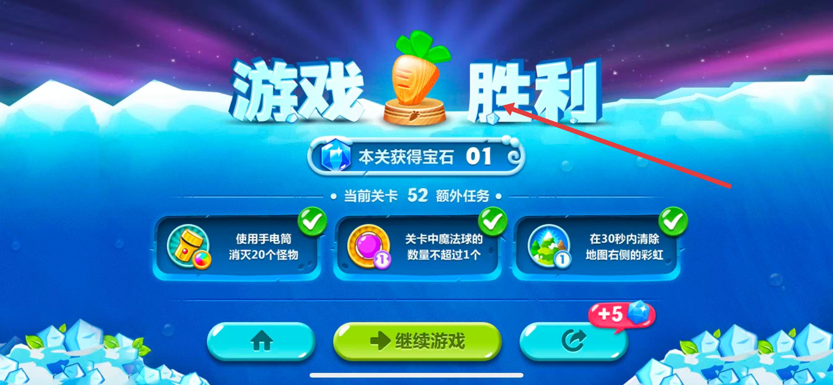 5、達(dá)成勝利條件后,界面顯示游戲勝利,可查看本關(guān)獲得寶石及額外任務(wù)完成情況,成功通過52關(guān)。
