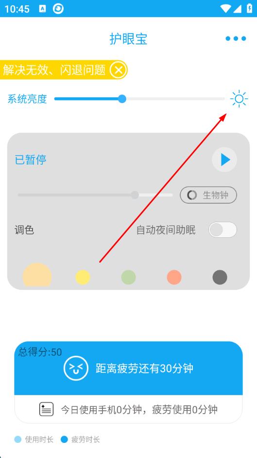 1、打開護(hù)眼寶APP,找到系統(tǒng)亮度旁的太陽(yáng)圖標(biāo),拖動(dòng)系統(tǒng)亮度滑塊,調(diào)節(jié)初始亮度。
