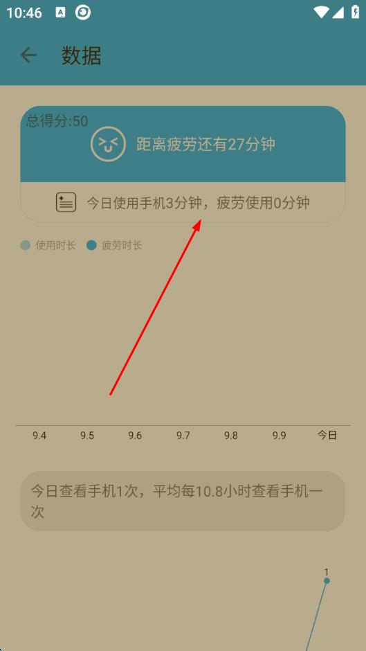 4、點(diǎn)擊下方的使用時(shí)長(zhǎng)區(qū)域,進(jìn)入數(shù)據(jù)頁(yè)面,能查看每日使用手機(jī)的時(shí)長(zhǎng)和疲勞使用時(shí)長(zhǎng),了解用眼情況。