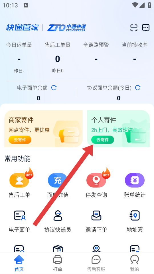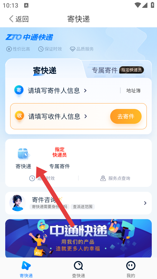 1、打開中通快遞APP首頁,點擊個人寄件模塊中的去寄件按鈕,進入寄件操作的頁面。