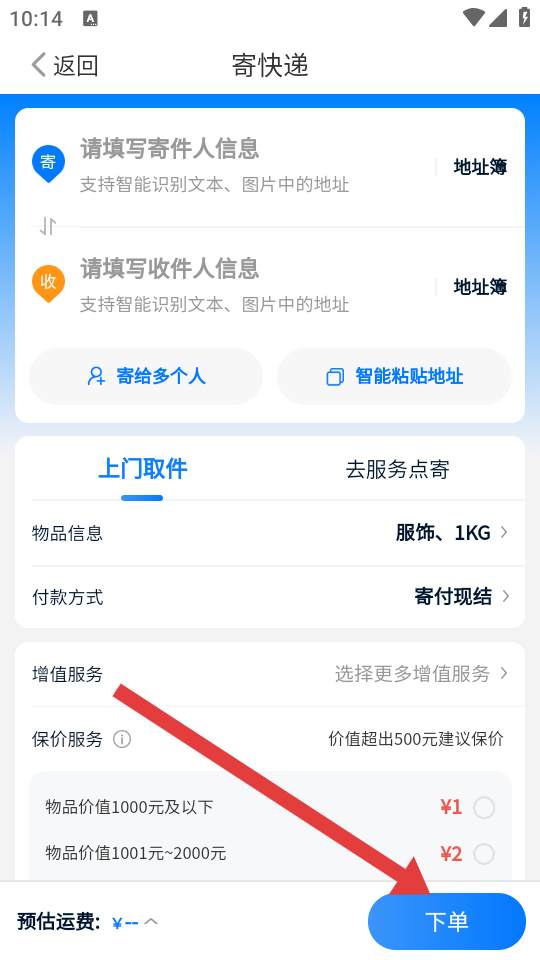 3、填寫寄件人、收件人信息,設置物品信息、付款方式等,確認無誤后點擊底部下單按鈕,完成上門取件預約。