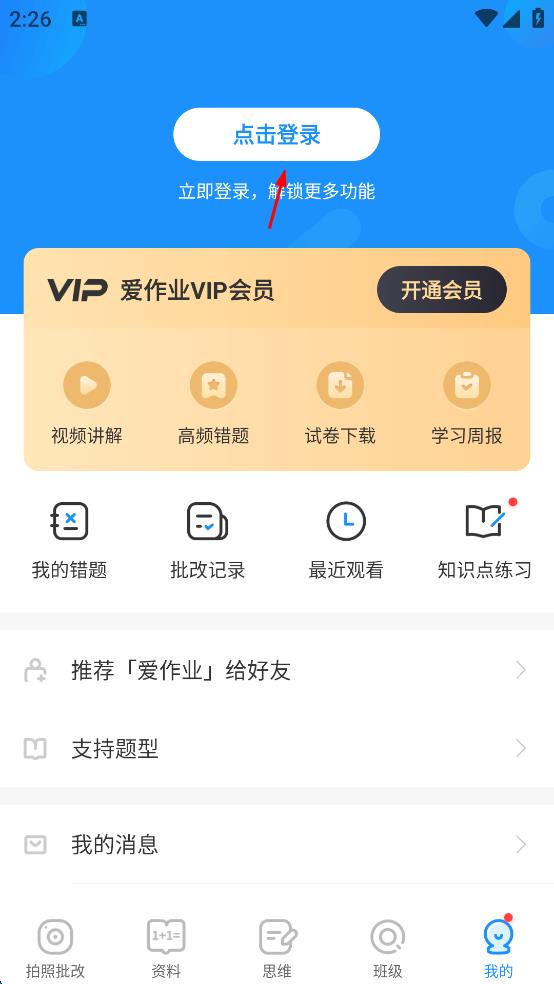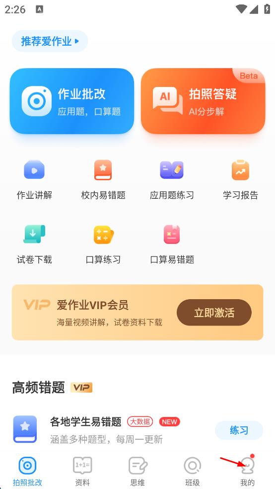 2、在愛作業(yè)APP主界面,點(diǎn)擊右下角“我的”,進(jìn)入個(gè)人頁面。