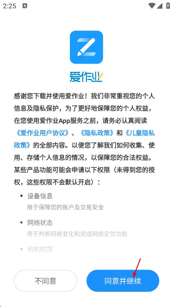 1、打開愛作業(yè)APP,彈出用戶協(xié)議、隱私政策等提示,仔細(xì)閱讀后點(diǎn)擊“同意并繼續(xù)”,進(jìn)入APP主界面。