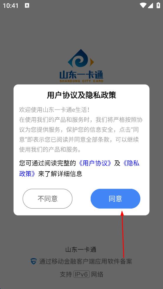 1、打開山東一卡通,會出現(xiàn)用戶協(xié)議及隱私政策界面,仔細閱讀后點擊“同意”,進入軟件主界面。