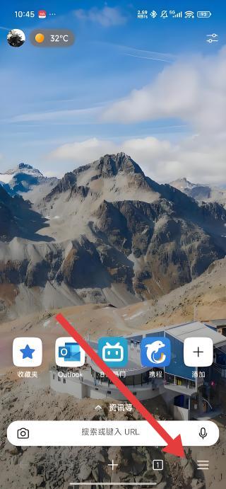 1、在瀏覽器界面中,點(diǎn)擊底部右側(cè)的菜單圖標(biāo),打開包含收藏夾、歷史記錄等功能的選項(xiàng)界面,為后續(xù)操作做準(zhǔn)備。