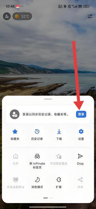 2、打開菜單后,找到并點(diǎn)擊藍(lán)色的登錄按鈕,進(jìn)入可同步歷史記錄、收藏夾等數(shù)據(jù)的登錄設(shè)置頁面,推進(jìn)賬號(hào)關(guān)聯(lián)。