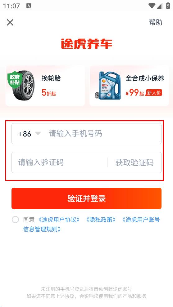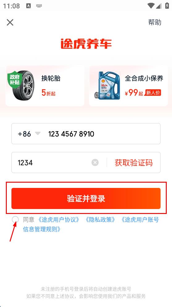 4、填寫好手機(jī)號(hào)和驗(yàn)證碼后,勾選同意途虎用戶協(xié)議,隱私政策,途虎用戶賬號(hào)信息管理規(guī)則,最后點(diǎn)擊“驗(yàn)證并登錄”按鈕,完成登錄操作。