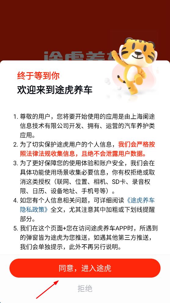 1、打開途虎養(yǎng)車軟件,彈出“終于等到你歡迎來到途虎養(yǎng)車”的提示頁面,閱讀相關(guān)內(nèi)容后,點(diǎn)擊“同意,進(jìn)入途虎”,進(jìn)入軟件主界面。