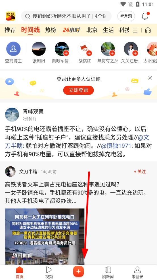 1、打開(kāi)搜狐新聞APP,點(diǎn)擊底部導(dǎo)航欄中間的+圖標(biāo),進(jìn)入發(fā)布頁(yè)面。