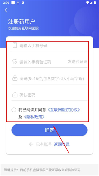 2、進入注冊新用戶頁面,輸入手機號碼,點擊“發(fā)送驗證碼”并填入收到的驗證碼,設(shè)置8-16位包含數(shù)字和大小寫字母的密碼,再次確認密碼,勾選協(xié)議及隱私政策。