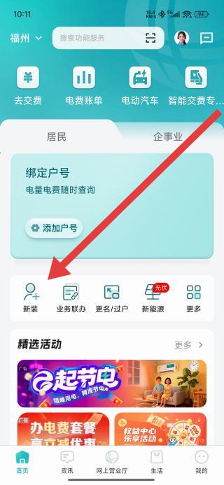 1、在首頁(yè)居民服務(wù)區(qū)域點(diǎn)擊新裝選項(xiàng),進(jìn)入新裝業(yè)務(wù)類(lèi)型選擇界面。