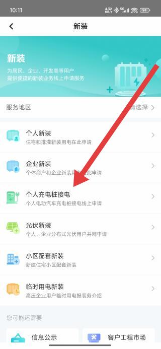 2、在新裝業(yè)務(wù)列表中選擇個(gè)人充電樁接電,查看該業(yè)務(wù)的辦理?xiàng)l件與所需材料。