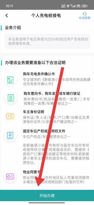 3、確認(rèn)個(gè)人充電樁接電的法定證明材料后,點(diǎn)擊頁(yè)面底部開(kāi)始辦理,啟動(dòng)業(yè)務(wù)申請(qǐng)流程。