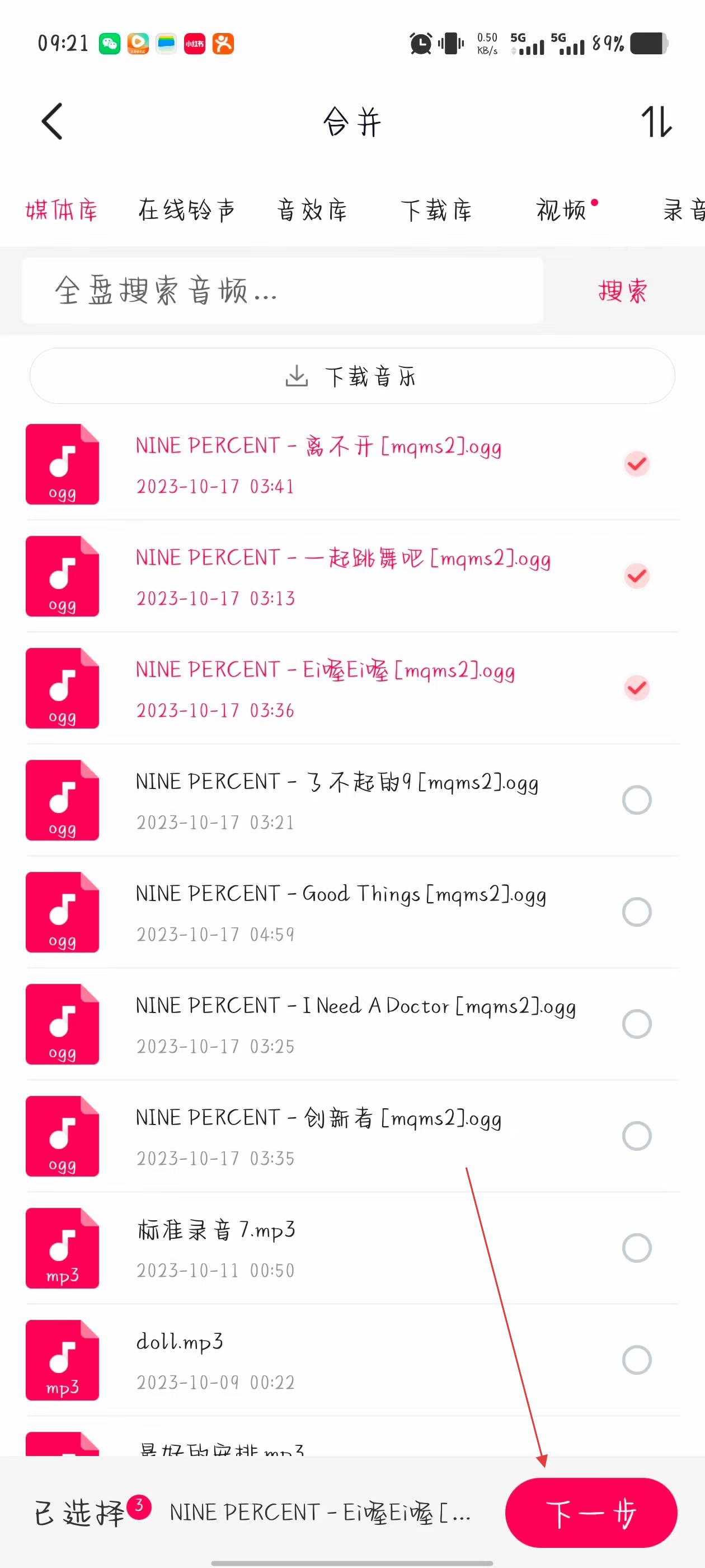 2、在合并界面,挑選需拼接合并的多段音頻,選好后點擊界面下方下一步。