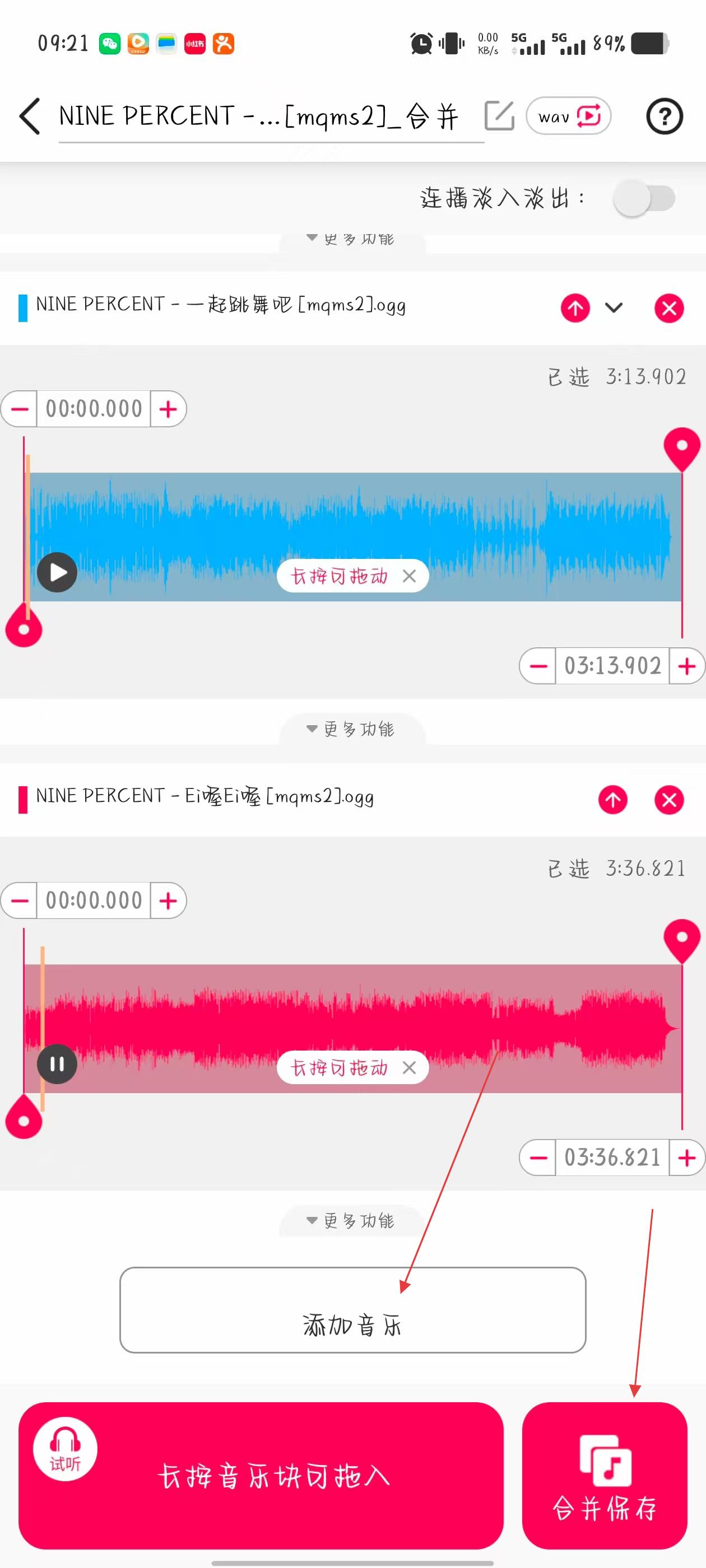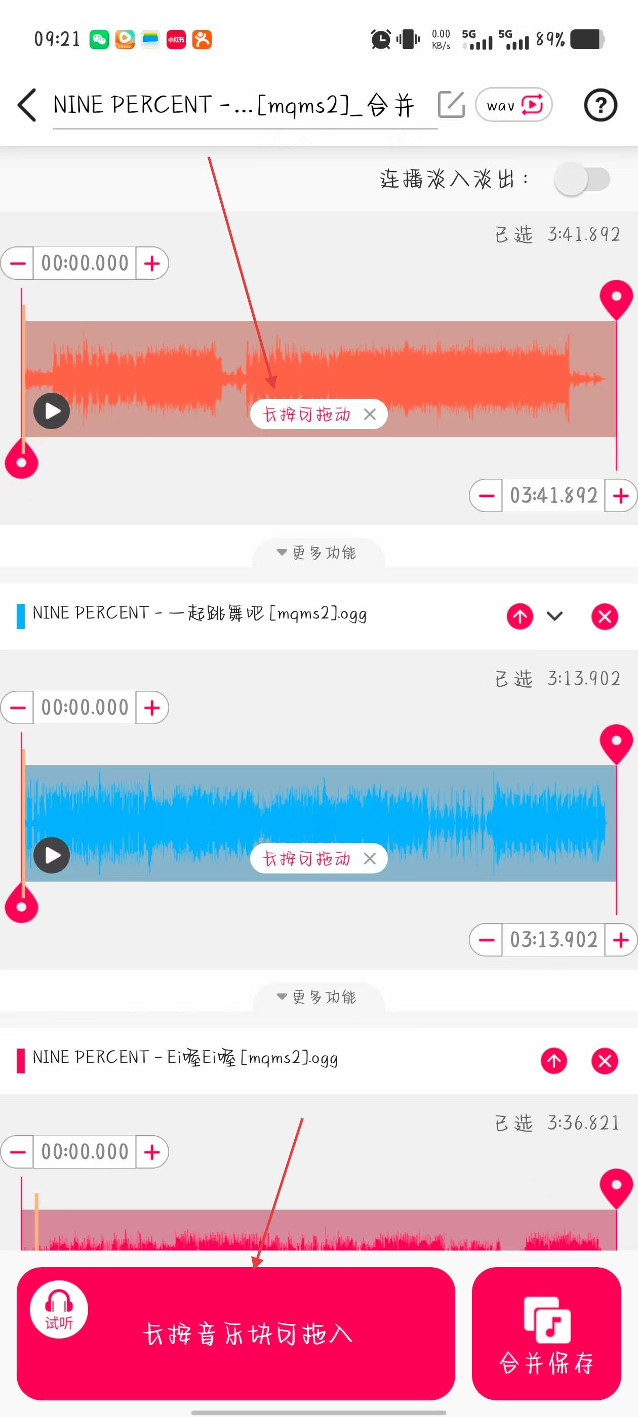 3、進入音頻合并編輯界面,長按音樂塊可拖動調(diào)整多段音頻的排列順序,長按還能拖入下方試聽。