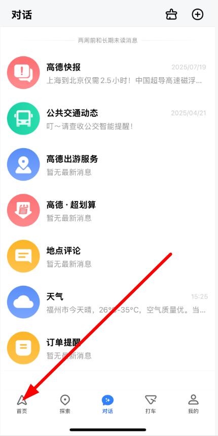 1、打開高德地圖App,點(diǎn)擊底部導(dǎo)航欄中的首頁(yè)進(jìn)入首頁(yè)界面。