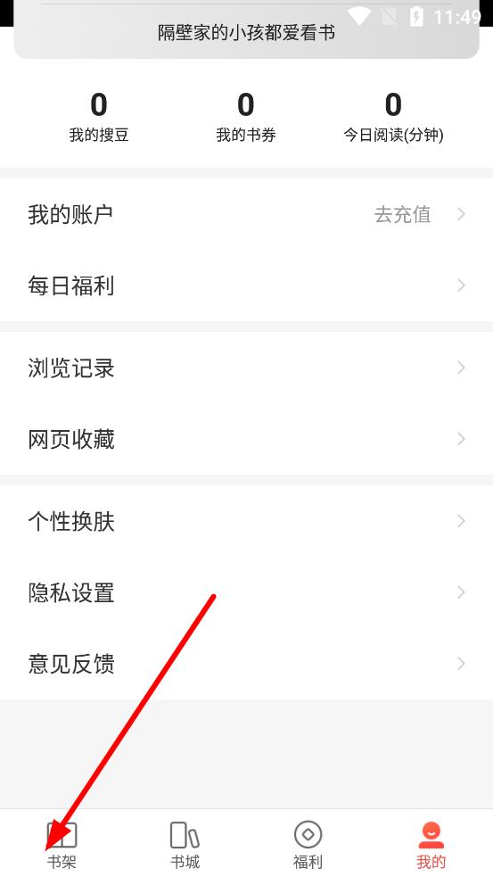1、打開(kāi)搜狗閱讀應(yīng)用,點(diǎn)擊底部導(dǎo)航欄中的書(shū)架選項(xiàng),進(jìn)入書(shū)架頁(yè)面。