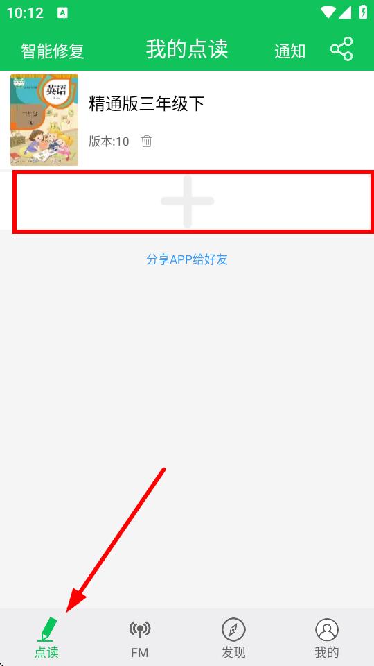 1、點(diǎn)擊底部導(dǎo)航欄中的點(diǎn)讀選項(xiàng),在我的點(diǎn)讀頁面中,點(diǎn)擊空白處的+圖標(biāo),