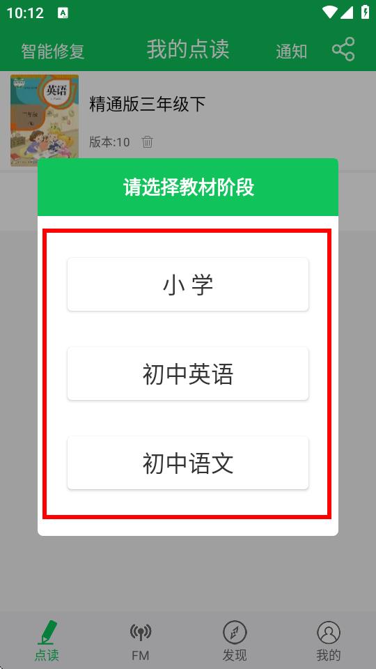 2、彈出請(qǐng)選擇教材階段窗口,選擇小學(xué)、初中英語或初中語文等教材階段。