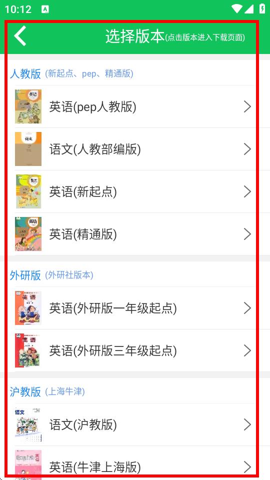 3、選擇教材階段后,進(jìn)入選擇版本頁面,在該頁面中點(diǎn)擊想要的教材版本,進(jìn)入下載頁面完成選書操作。