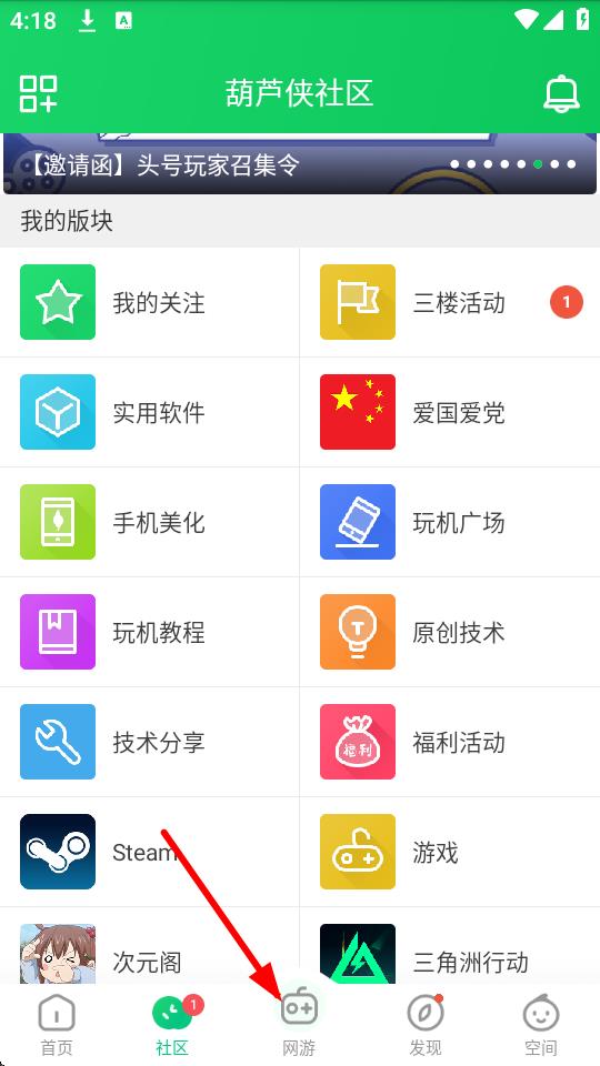1、打開葫蘆俠應用,點擊底部導航欄中的網游選項,進入網游頁面。
