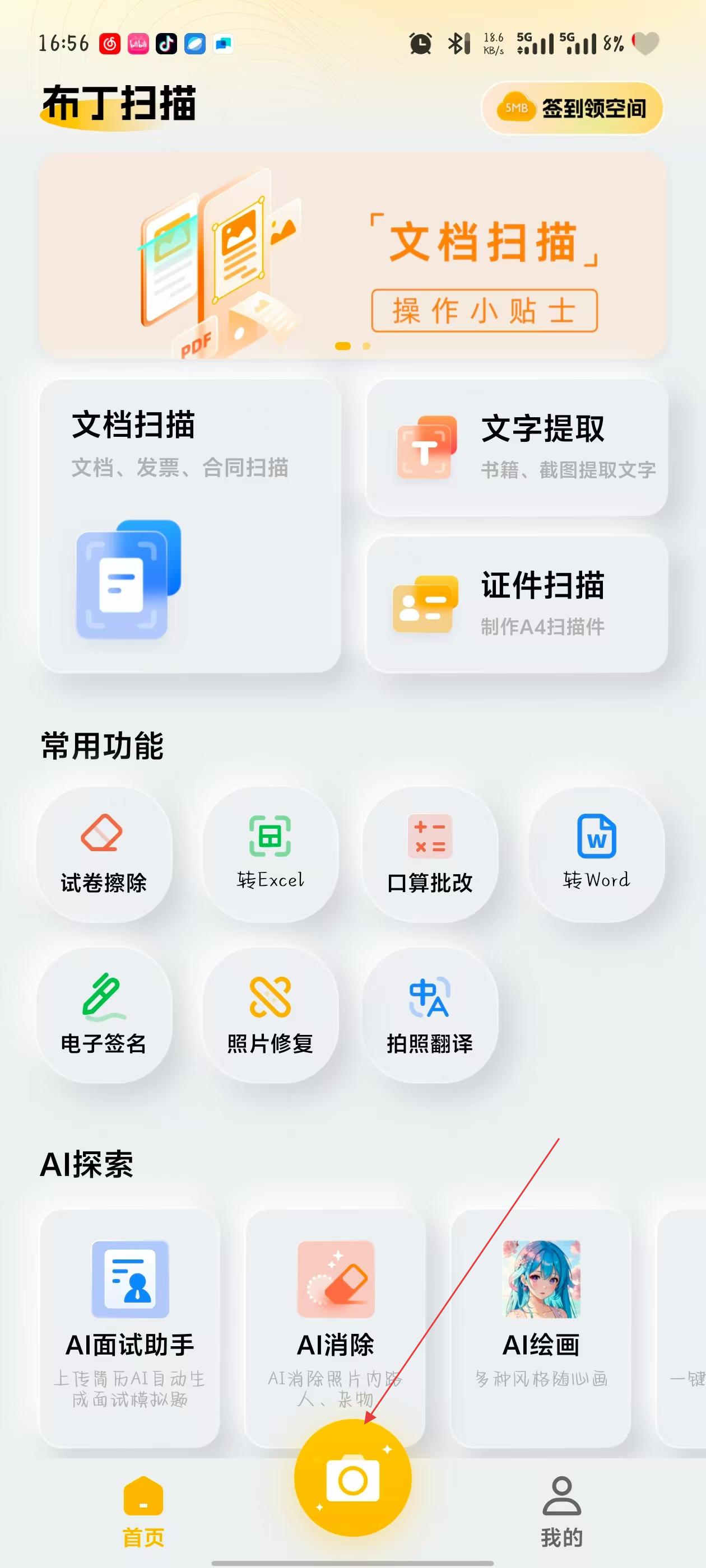 1、打開布丁掃描應(yīng)用,在首頁(yè)點(diǎn)擊下方黃色拍照?qǐng)D標(biāo)。