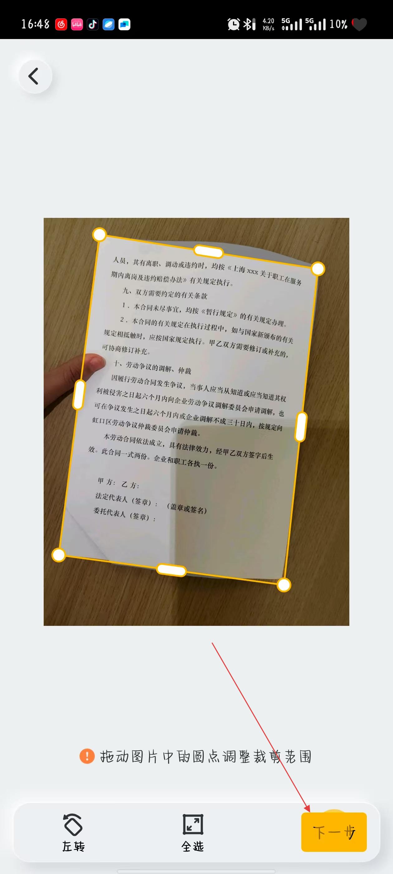 3、點(diǎn)擊拍攝按鈕完成拍攝后,在裁剪界面拖動(dòng)邊緣的調(diào)整點(diǎn),把文檔區(qū)域精準(zhǔn)框選出來,然后點(diǎn)擊下一步。