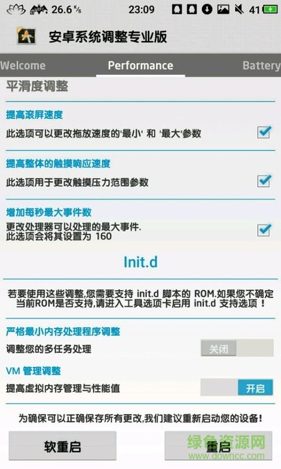 安卓調(diào)整專業(yè)版 Android Tweaker Pro是款系統(tǒng)優(yōu)化工具,需要root權(quán)限,能對多個系統(tǒng)參數(shù)進行設置和調(diào)整。包括apk優(yōu)化、內(nèi)核調(diào)整、GPS設置、音頻音量調(diào)整、圖像質(zhì)量調(diào)整、網(wǎng)速提升、節(jié)能等。