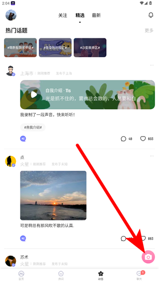 2.在動(dòng)態(tài)界面,點(diǎn)擊右下角的相機(jī)圖標(biāo),進(jìn)入發(fā)布動(dòng)態(tài)界面。