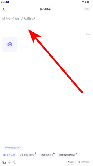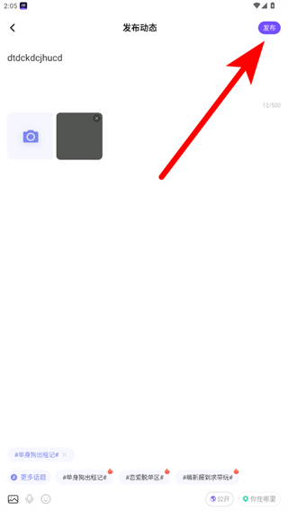 3.在發(fā)布動(dòng)態(tài)界面,輸入你想說(shuō)的話如dtdckdcjhucd,也可點(diǎn)擊相機(jī)圖標(biāo)添加圖片。