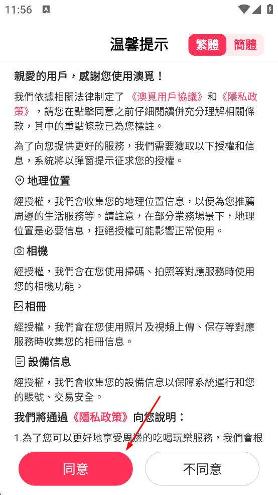 1、打開(kāi)澳覓APP,出現(xiàn)溫馨提示頁(yè)面,仔細(xì)查看后點(diǎn)擊“同意”按鈕。
