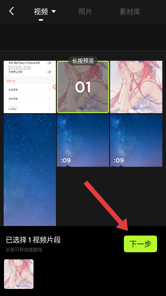 2、在素材選擇界面選取目標(biāo)視頻素材,點(diǎn)擊下一步,進(jìn)入視頻編輯界面。