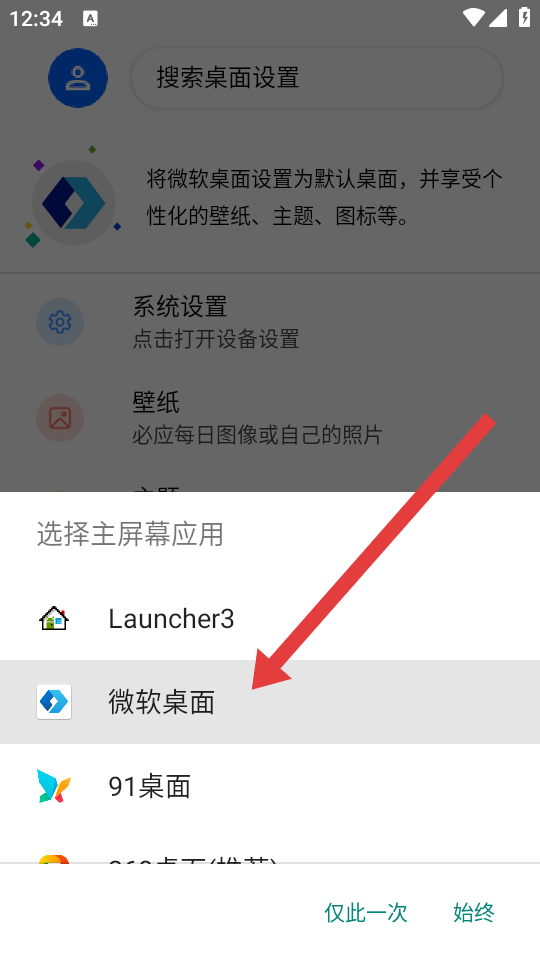 4、在選擇主屏幕應用的彈窗中,點擊微軟桌面,并根據(jù)需求選擇僅此一次或始終。