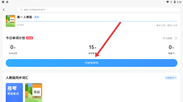 1、在APP首頁同步學(xué)習(xí)區(qū)域,點(diǎn)擊英語單詞圖標(biāo),進(jìn)入單詞學(xué)習(xí)頁面,可查看當(dāng)日學(xué)習(xí)計(jì)劃與同步詞匯,開啟英語單詞學(xué)習(xí)流程。