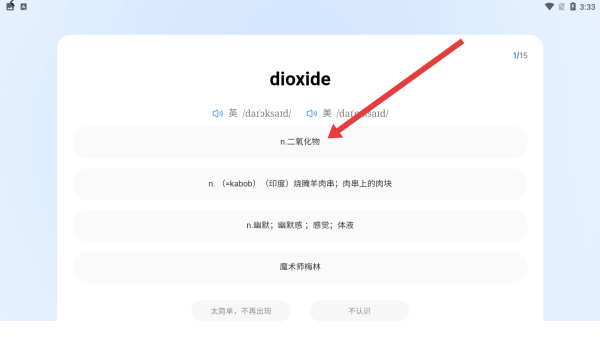 3、進(jìn)入背單詞界面,查看dioxide的音標(biāo)、釋義如n.二氧化物,通過認(rèn)讀、理解,完成該單詞的學(xué)習(xí)記憶,提升詞匯儲(chǔ)備。