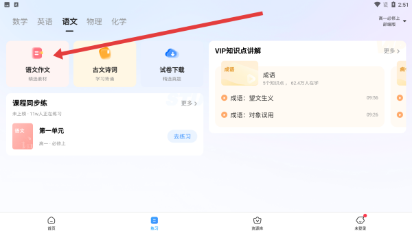 1、在語(yǔ)文學(xué)習(xí)板塊點(diǎn)擊語(yǔ)文作文圖標(biāo),進(jìn)入作文功能界面,可使用AI寫(xiě)作、作文批改等工具,開(kāi)啟作文學(xué)習(xí)流程。