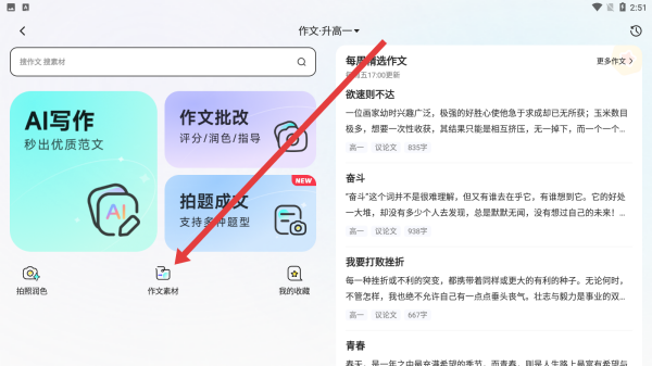 2、進(jìn)入作文界面后點(diǎn)擊作文素材選項(xiàng),跳轉(zhuǎn)至素材頁(yè)面,瀏覽每周精選作文及分類素材,獲取寫(xiě)作靈感。