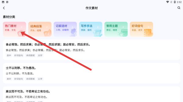 3、在作文素材頁(yè)面選擇熱門(mén)素材分類,查看其中經(jīng)典語(yǔ)句與論述內(nèi)容,為作文寫(xiě)作積累優(yōu)質(zhì)素材,助力創(chuàng)作。